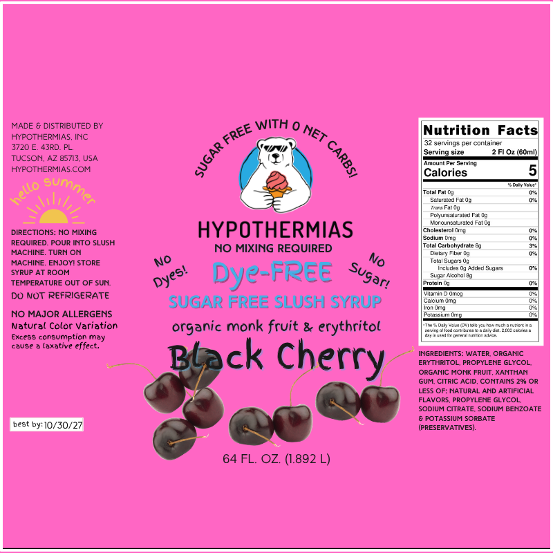 Order now to upgrade your flavor experience with Hypothermias SUGAR FREE Dye-FREE Black Cherry Slush Syrup! Whether you're using a slushie machine at home or making sugar-free frozen desserts, you can enjoy a delicious and guilt-free treat with every pour.