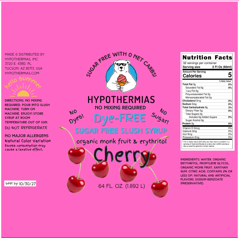Order today and enjoy the timeless taste of cherry with Hypothermias SUGAR FREE Dye-FREE Slush Syrup!