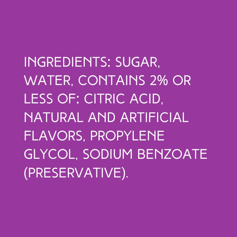 CANEÂ SUGAR, WATER, CONTAINS 2% OR LESS OF: CITRIC ACID, NATURAL AND ARTIFICIAL FLAVORS, PROPYLENE GLYCOL, SODIUM BENZOATE (PRESERVATIVE).