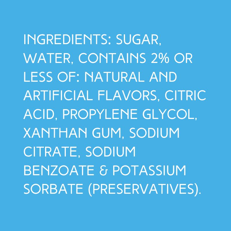INGREDIENTS: CANE SUGAR, WATER, CONTAINS 2% OR LESS OF: NATURAL AND ARTIFICIAL FLAVORS, CITRIC ACID, PROPYLENE GLYCOL, XANTHAN GUM, SODIUM CITRATE, SODIUM BENZOATE & POTASSIUM SORBATE (PRESERVATIVES).