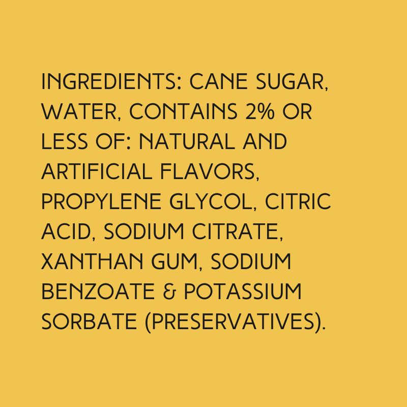 INGREDIENTS: CANE SUGAR, WATER, CONTAINS 2% OR LESS OF: NATURAL AND ARTIFICIAL FLAVORS, PROPYLENE GLYCOL, CITRIC ACID, SODIUM CITRATE, XANTHAN GUM, SODIUM BENZOATE & POTASSIUM SORBATE (PRESERVATIVES).