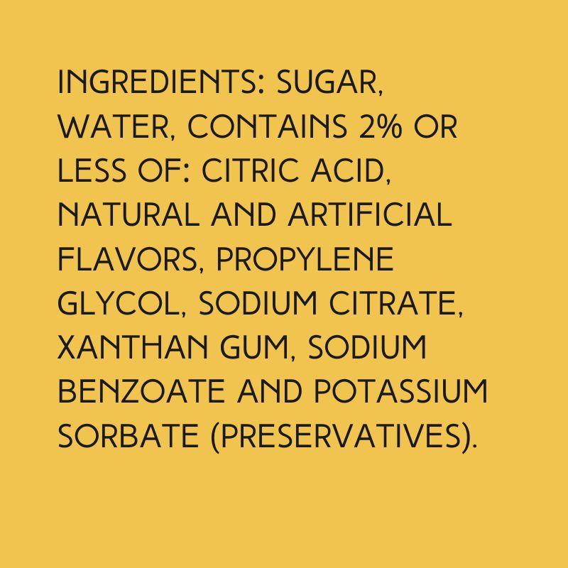 INGREDIENTS: CANE SUGAR, WATER, CONTAINS 2% OR LESS OF: CITRIC ACID, NATURAL AND ARTIFICIAL FLAVORS, PROPYLENE GLYCOL, SODIUM CITRATE, XANTHAN GUM, SODIUM BENZOATE AND POTASSIUM SORBATE (PRESERVATIVES).