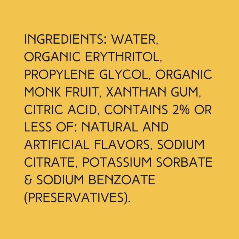 WATER, ORGANIC ERYTHRITOL, PROPYLENE GLYCOL, ORGANIC MONK FRUIT, XANTHAN GUM, CITRIC ACID, CONTAINS 2% OR LESS OF: NATURAL AND ARTIFICIAL FLAVORS, SODIUM CITRATE, POTASSIUM SORBATE & SODIUM BENZOATE (PRESERVATIVES).